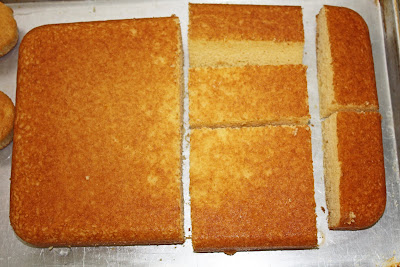 To make this cake I poured 2 cupcakes and then the rest of the batter went into a 9x13 pan. When it had cooled I took them out of the pan and froze them. Then I cut them like this.
