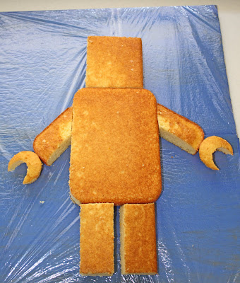 I cut a a little bit off the arms so they would angle down and I rounded the corners on the left side of the body to match the right. Once it is assembled it won't fit on a cookie sheet ( my usual choice) so I used some cardboard covered in plastic wrap.