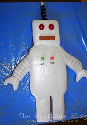 When you go to mix your frosting, if the black food coloring makes your frosting look a little lavender instead of grey, add a tiny drop of yellow to fix it. Crumb coating is a MUST with this cake. After you crumb coat it put it in the freezer for at least ten minutes so the frosting will get hard. It will make frosting the second coat much easier. You will need a lot of frosting since there is a lot of surface area to cover. It will take awhile to get it nice and smooth since there are a lot of nooks and crannies so make sure you budget your time well. I piped a darker grey frosting for the lines on the arms. It might be cute to add them to the legs as well. I used a Kit Kat for the mouth, Life Savers for the eyes, a pipe cleaner for part of the antennae, and gum drops for the on/off buttons and top of the antennae.