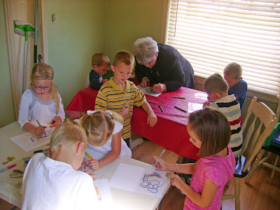 We left the front room and went into the dining room that is attached to the kitchen. I had an extra table set up. School had just started so I thought it would be fun to make a charm to hang from their backpacks. We used Shrinkie Dink to make them. If you have never used it before you are missing out! It is the coolest thing ever. You can buy it at Michael's or Robert's craft or directly online. It comes as thin plastic sheets. You draw on it using permanent markers, cut it out and bake it in the oven for a couple minutes and it shrinks! It also becomes thicker. The kids got a kick out of watching it too. To make things as easy as possible, I had drawn different safari animals on paper. I cut the shrinkie dink sheets in half. Then they taped (so it wouldn't slip) them on to whatever animal paper they wanted and traced it. I had a lot of different colored markers for them to color them. My mom and a friend helped me with this because some kids needed help cutting the animals out. We hole punched them so we could fit a metal key chain ring through it later.